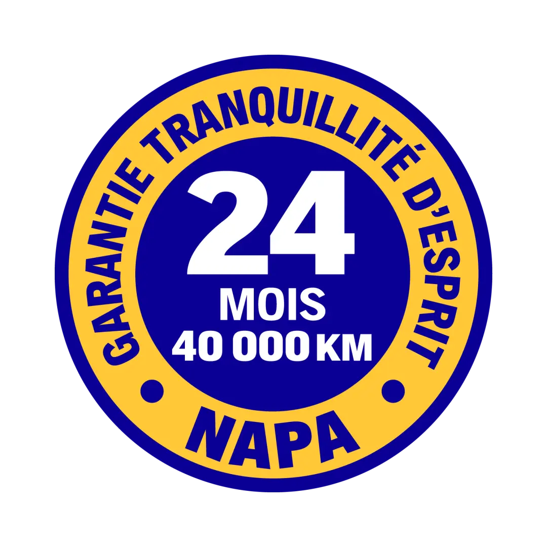 La garantie limitée Tranquillité d'esprit NAPA AUTOPRO* vous offre 24 mois/40,000 kilomètres de protection sans souci sur les pièces et la main-d'œuvre admissibles lorsqu'elles sont effectuées initialement dans votre centre de service NAPA AUTOPRO. Cette garantie écrite sera honorée dans plus de 17 000 centres de garantie NAPA autorisés à travers l'Amérique du Nord.